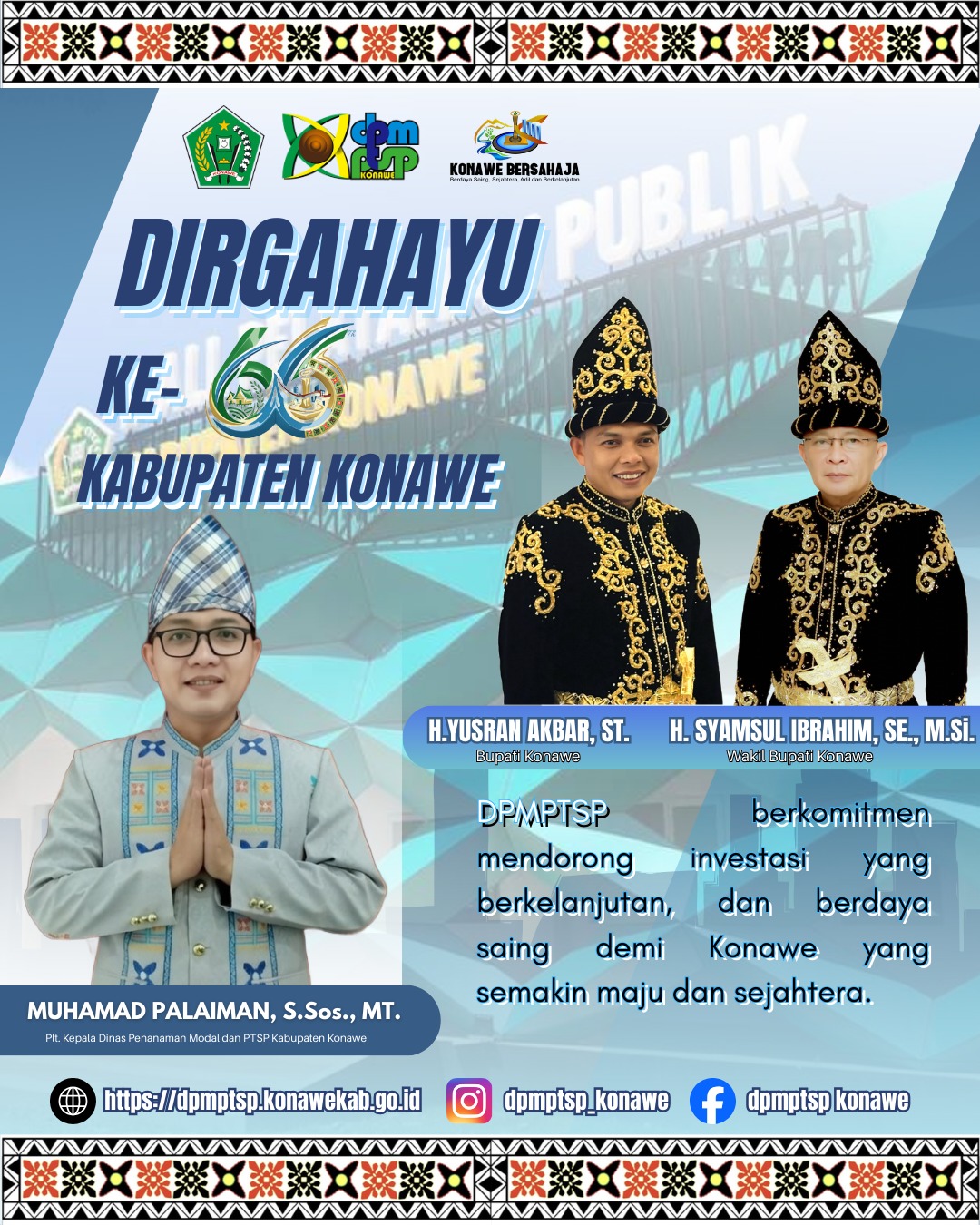 03 Mar 2026Dalam rangka memperingati Hari Ulang Tahun ke-66 Kabupaten Konawe, DPMPTSP Kabupaten Konawe turut menyampaikan ucapan Dirgahayu serta komitmen berkelanjutan dalam mendukung pembangunan daerah melalui peningkatan investasi yang berkualitas dan berdaya saing. Momentum peringatan ini menjadi refleksi atas capaian pembangunan yang telah diraih bersama di bawah kepemimpinan Bupati Konawe H. Yusran Akbar dan Wakil Bupati Konawe H. Syamsul Ibrahim. Sinergi antara pemerintah daerah dan seluruh pemangku kepentingan terus diperkuat guna mewujudkan Konawe yang semakin maju dan sejahtera. Plt. Kepala DPMPTSP Kabupaten Konawe, Muhamad Palaiman, menegaskan bahwa DPMPTSP berkomitmen mendorong investasi berkelanjutan, mempercepat pelayanan perizinan yang transparan dan akuntabel, serta menciptakan iklim usaha yang kondusif bagi para investor. Melalui semangat “Dirgahayu ke-66 Kabupaten Konawe”, diharapkan kolaborasi dan inovasi terus tumbuh untuk memperkuat struktur ekonomi daerah serta membuka peluang usaha dan lapangan kerja yang lebih luas bagi masyarakat.